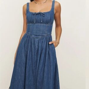 Chic blue midi dress by Reformation in the iconic Balia cut. Features a fitted bodice and flared skirt. Perfect for casual outings.