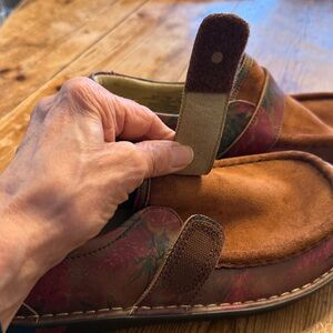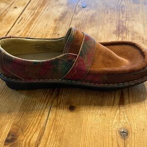 Alegria by PG lite Marie leather slip on shoes “southern romance “ or brown suede with red & green floral paisley leather pattern. Adjustable hook & loop strap