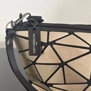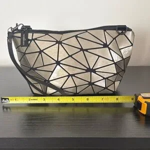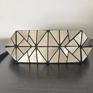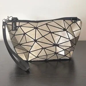 Stylish clutch with bold geometric design. Features a convenient wristlet strap and heavy black chain. Perfect for a modern look. Brand new. Never been used.