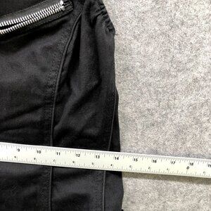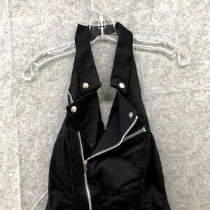 Stylish black mini dress. Features halter neck and zipper details. Ruffled hem adds flair.