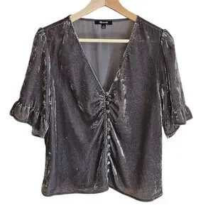Madewell velvet button-front top (Style K5737) in a shimmering gunmetal grey. This blouse features a deep V-neckline with fabric-covered loop buttons and ruching at the bust for a flattering fit. Designed with elbow-length puff sleeves finished with feminine ruffle cuffs. A luxurious texture perfect for holiday parties or elevating a pair of jeans.