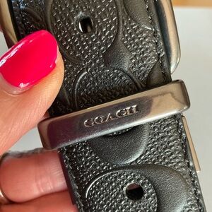 Elegant black belt by Coach. Features embossed pattern and sleek silver buckle.Mens belt , never used, bought at a coach outlet, 50” inches long, in excellent condition