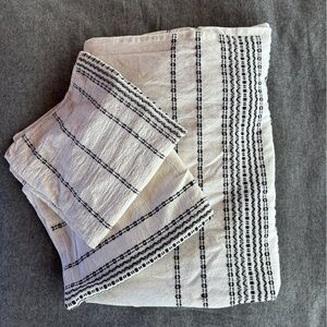 Rippled Stripe set…100% organic cotton duvet and shams from Coyuchi. Textured, heavyweight cotton top with black embroidered stitching. Back is a smoother textured cotton. Color is a soft ivory white. Two matching Euro size shams(currently sold out on the website). Coconut shell buttons on all pieces. In great “enjoyed” condition. No stains or tears, but definitely not brand new. Some mild variance in the color between the shams and duvet(not super noticeable). Original retail was over $500 for the three pieces. Freshly laundered in natural, chemical free detergent. Due to the weight, this set can’t be bundled with other items. However, in general…