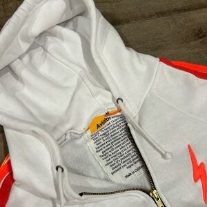 Aviator nation white sweatpant and zip up hoodie set with neon stripes