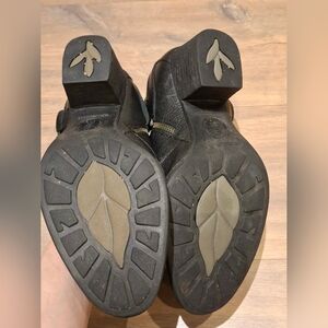 Beautiful black leather boots with a low profile and a moderate heel; brushed metal accents on the sides give a slight Western or moto-inspired feel; stacked wood/wood effect heel; sturdy rubber sole; soft microsuede lining; welted sole; light wear (as pictured)