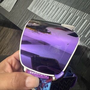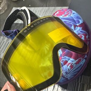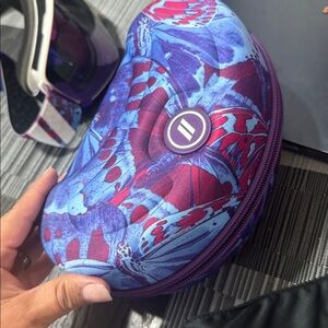 Blenders Eyewear ski goggles with a colorful butterfly case. Includes a yellow lens and protective pouch.