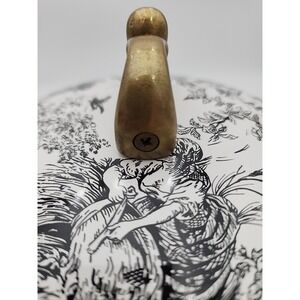 It features a black and white scenic garden pattern with a gardener pushing a wheelbarrow a lady gathering straw, a sheep, botanicals, and the bottom part is a pond scene with ducks and other fowl. It has ornate brass handles.