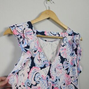 Keywords: Lilly Pulitzer, dress, ruffle sleeve, knit dress, stretch dress, pink dress, blue dress, casual dress, summer dress, spring dress, printed dress, XS, extra small, sleeveless dress