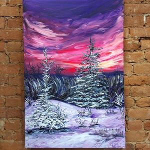 Experience the serene beauty of a winter landscape with this vibrant canvas art. Featuring rich purples and pinks, this piece brings a touch of nature's elegance to your home decor.