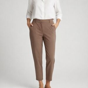Sleek taupe ankle trousers with a clean tailored silhouette and smooth drape.