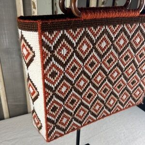 Stylish and versatile, this handcrafted knitted plastic grid woven tote bag features a striking brown and white geometric pattern. Cool handles that are plastic or possibly Bakelite given age. Perfect for any occasion, a day out or at the farmers markets it combines fashion with functionality.