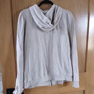 marled grey and oat colored yarn in Jersey knit, brass zipper hoodie with pockets. draw string waist pants with pockets and knit cuffed bottoms. drawstring is missing from hoodie.
