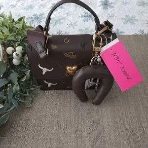 Stylish dark brown mini bag with western motifs. Features heart and horseshoe details. Perfect for adding flair.