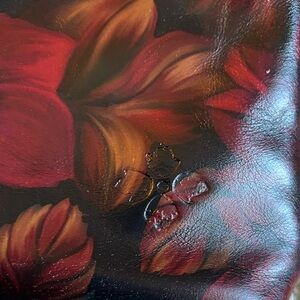 Elegant women's bag featuring a vibrant floral design. The bag showcases a stunning combination of red and black colors, perfect for adding a touch of sophistication to any outfit. The metal handles provide a modern and stylish touch. 4381