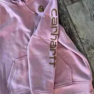 Soft light pink hoodie with front pocket. Features Carhartt logo on chest. Relaxed fit, new without tags, never worn