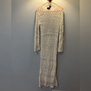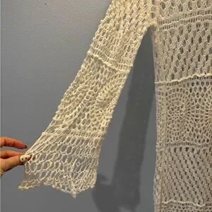 Chic cream crochet dress with long sleeves. Perfect for versatile styling. Adds elegance to any look. swimsuit cover-up.