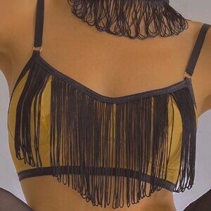 The Zazzy Zelda bra is reminiscent of the 1920's -- gold cloaked in black with swinging tassels dripping of Gatsby-esque glamour. This piece is all about motion - swaying, sashaying, swinging.