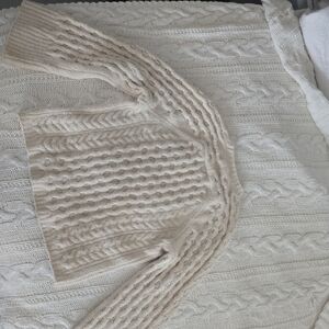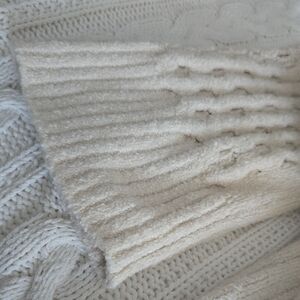 Elegant cream sweater with intricate cable-knit design. Soft bouclé texture. Ideal for layering.