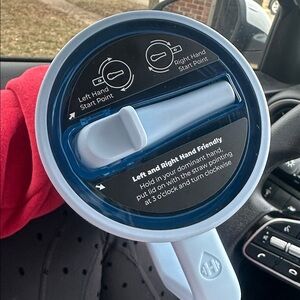 Sky blue Hydro Flask tumbler with sturdy handle. Elegant and practical design.