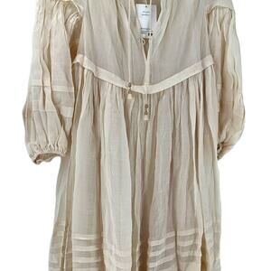 Introducing the Zimmermann Moonshine Tuck Midi Dress, a stunning addition to any fashion-forward woman's wardrobe. Zimmermann, an iconic Australian brand, has been at the forefront of fusing fashion and swimwear since the 90s. This dress is a prime example of their ability to create sophisticated femininity with original prints and fun colors.Featuring a split neckline with self-tie closure, ruffle trim, and pleated detailing, this dress exudes elegance and charm. The elastic cuffs and slip dress lining provide a comfortable and easy fit, while the slip-on styling makes it effortless to wear. Measuring approximately 56 inches from shoulder to hem, this dress is designed to flatter a range of body types.The model is 5'11 and is wearing a size 1, but measurements may vary slightly by size. Made of 100% ramie, this dress should be dry cleaned only to preserve the quality of the fabric. Imported with care, the Zimmermann Moonshine Tuck Midi Dress in vanilla is the perfect addition to your wardrobe for any occasion.