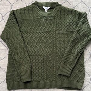 Stay warm and stylish with this green cable knit sweater. Perfect for any casual outing.