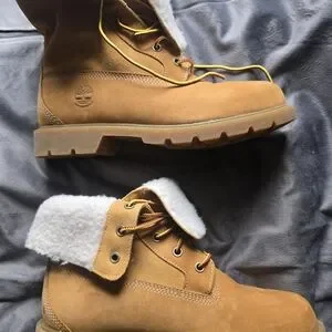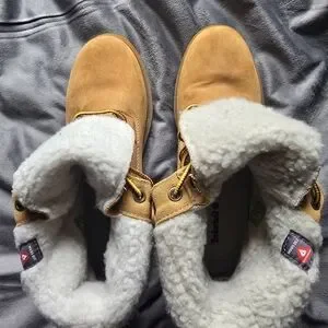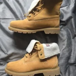 Stylish Timberland boots in tan leather with cozy shearling lining. Water proof and perfect for outdoor adventures. Never worn, brand new without the box or tags. This item comes from a smoke-free home!