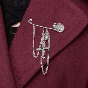 - Silver statement skull safety pin brooch on lapel features skull & cross charms