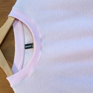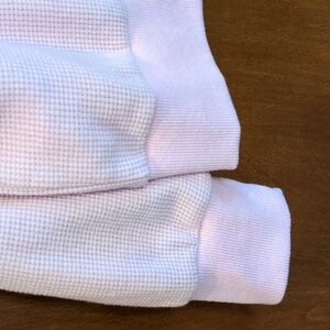 Stay cozy and stylish with this light pink/lavender waffle weave thermal style fabric sweatshirt. Ribbed detailing at hem, cuffs and collar. Perfect for any casual outing.