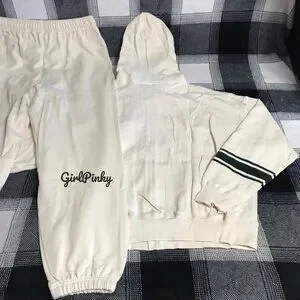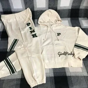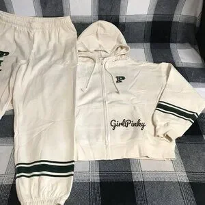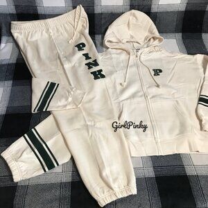 VS PINK CAMPUS SWEATPANTS OUTFIT & CAMPUS FULL ZIP LOGO HOODIE IN WHITE SHELL & DARK GREEN STRIPES LOGO. BOTH THE FULL ZIP AND THE SWEATPANTS FIT SLIGHTLY OVERSIZED. THESE SWEATPANTS ARE CUFFED AT THE BOTTOM AND HAVE SIDE POCKETS. THE LOGO ON THIS HAS A VELVET TO IT.