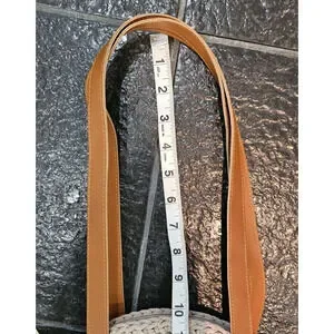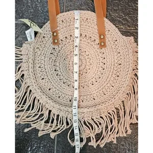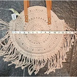 Collection Eighteen 18 - Crochet Round Shoulder Bag in Latte - Zip Around Closure - Fringe Detail - 100% Cotton w/ a Textured 100% Cotton Lining - Faux Leather Brown Shoulder Straps - Bohemian Style - Well Made Woven Cotton