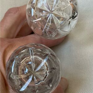 I have two listings for these Salt & Pepper Shakers. This pair is in much better condition. One shaker still has original Waterford Crystal Sticker on it. See photos.