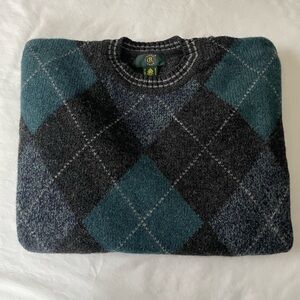 Men’s Large Shetland 100% Wool Argyle Crewneck Sweater - Teal and Gray,