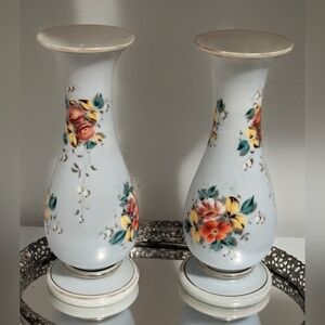 A charming, matched pair of antique opaline glass vases, dating to the late 19th-century Victorian era. These elegant, hand-blown vessels feature an opaque, soft blue-white opaline ground, richly adorned with hand-painted floral designs in red, yellow, green, and white.
