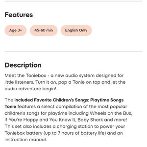 Just remove the Tonie to stop, or put it on top to start playing! Really perfect for littles that love to sing, dance, and be read to. Other Tonies can be purchased separately to add to their collection. Amazing gift for toddlers and preschoolers!