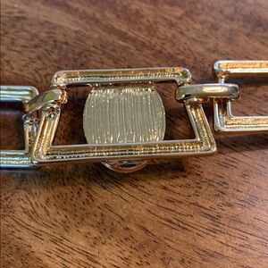 Nice gold tone links statement necklace with a large green stone set. New without tags. Necklace is 18” with an additional 3” to adjust. Large links are 1”x1.5”. Stone is 1”. This is a beautiful necklace!