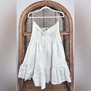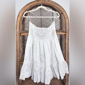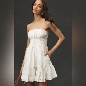 Anthropologie The Somerset Strapless Mini Dress in white. This is the strapless version of Anthropologie’s bestselling Somerset silhouette, featuring a smocked waist, tiered A-line skirt, and side slant pockets. Made from breathable cotton with a soft viscose lining. Pullover style.