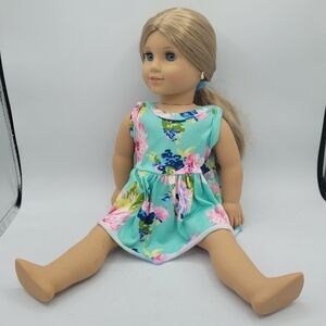 This beautiful blonde haired blue eyed 18 inch American Girl Doll is beautiful. She has pierced ears and is in great condition. She comes as pictured with dress.