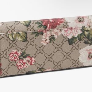 Chic Nine West wallet with floral pattern. Beige background with pink and red flowers. Perfect for adding elegance to your look.