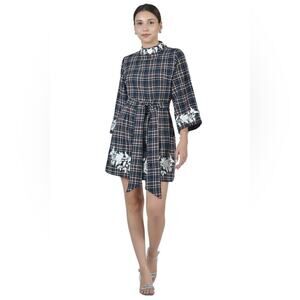 The Layla dress features a classic tartan tweed fabrication that exudes timeless sophistication. The flattering A-line silhouette is complemented by a chic mock neckline and wide 3/4 sleeves, while intricate white and gold floral embroidery accents the collar, sleeve cuffs, and hemline.