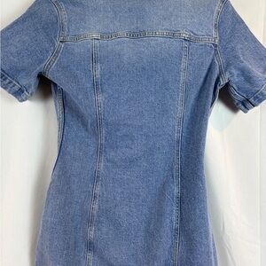 Stylish denim mini dress. Button-up front. Short sleeves. Perfect for casual outings.