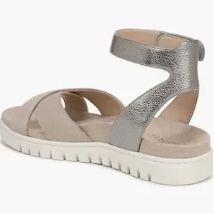 VIONIC Uptown Merced Strappy Sandal in Cobblestone Multi. Step out in style with these elegant silver and stone sandals. Perfect for any occasion, they offer both comfort and sophistication. Ankle Velcro strap closure. Cushioned insole with arch support. Leather upper, rubber sole. Brand new in original box! Size 10