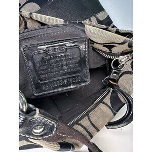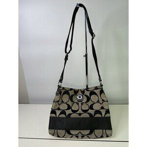 The Coach Signature Authentic Khaki Brown Stripe Crossbody File Bag F-19220 Purse is a stylish and versatile accessory for women. Made with a combination of canvas and fabric, this medium-sized bag features a signature C's stripe pattern and silver hardware accents. The bag has a zip closure, brown handle/strap, and a lightweight design with adjustable cross-body strap for easy carrying. With multiple inner and outer pockets, including a mobile phone pocket, this purse is both practical and fashionable. Perfect for everyday use, this Coach bag adds a touch of sophistication to any outfit.