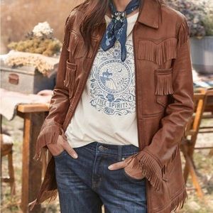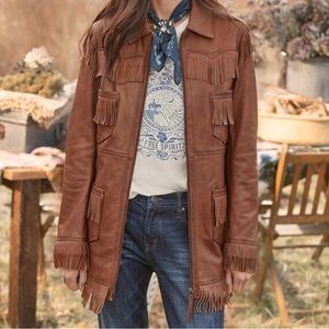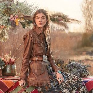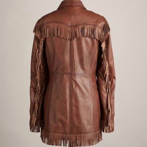 Embrace a bohemian style with this brown fringe jacket. Perfect for adding a touch of flair to any outfit.