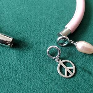 Elegant Endless Jenifer Lopez collection Rose pink leather bracelet featuring a sterling silver Peace symbol charm and freshwater Pearl/silver charm. Perfect for adding a touch of sophistication to any outfit.
