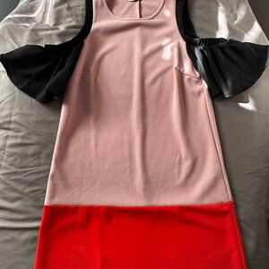 Chic and eye-catching ZARA dress featuring a soft blush pink body, bold red/coral hem, and dramatic black ruffle cold-shoulder sleeves. Flowy, comfortable fit with a polished modern vibe—easy to dress up or down.