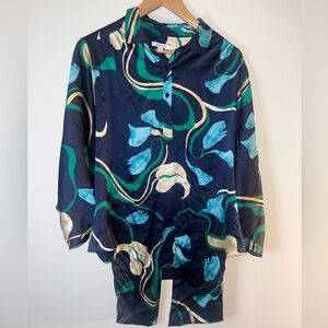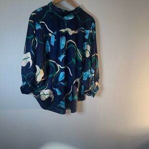 Blue, green. Teal, tan floral top. Balloon sleeves. Button down. Silky feel. Ties in front. No notable flaws.