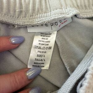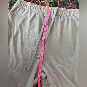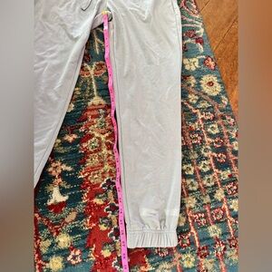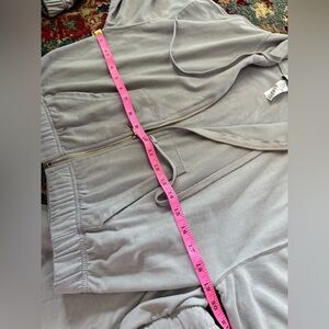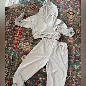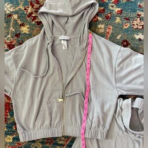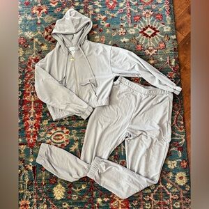Stay comfortable and stylish with this women's light gray hooded crop zip-up hoodie and jogger set. Perfect for a casual, athleisure style look. Super comfortable. Never been worn-no tags. Tie on hoodie and waist of joggers.