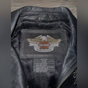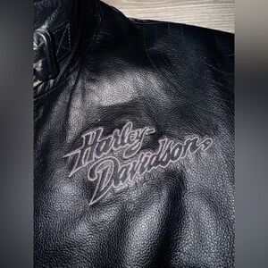 Amazing quality, vintage ISIS Eagle Black Harley Davidson leather jacket. Outer shell is genuine leather. Has dark grey-ish purple embroidery throughout the design.