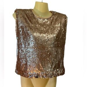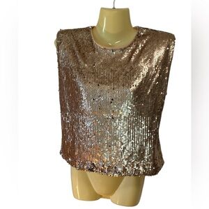 TCEC Sequin Crop Top Sleeveless Back Zip Shiny Shimmering Holiday Gold Small. Dazzle in this gold sequin crop top. Ideal for parties and celebrations. Shoulder pads.