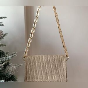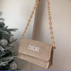 Experience the elegance of Dior with this tan clutch, crafted from a woven material that exudes sophistication. The standout feature is its chunky chain strap, adding a touch of modern luxury to its design. Perfect for both casual outings and formal events, this bag is a versatile addition to any wardrobe.